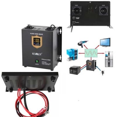 DC/AC инвертер с входно напрежение 12VDC, изходно напрежение 230VAC, номинална мощност 500W. Изходното напрежение е със синусуидална форма. Защита при претоварване, от пренапрежение, от късо съединение на изхода и термична защита. Индикатор за нивото на заряд на акумулатора. UPS функция. Подходящ за резервно захранване и зарядно устройство за локални отоплителни системи, парно и др. Не се предлага за онлайн продажба.