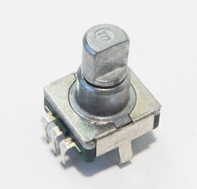 Ротационен енкодер VOLUME +/- с 30 положения и бутон. Размери на основата 12x12mm, диаметър на оста 6mm, обща височина 16mm.
