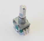 Ротационен енкодер VOLUME +/- с 30 положения и бутон. Размери на основата 12x14mm, диаметър на оста 6mm, обща височина измерена от печатната платка 27mm.